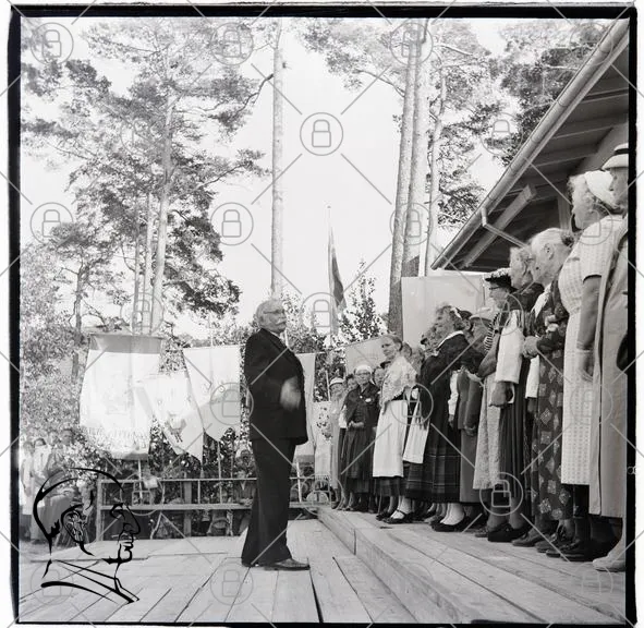 utomhus, scen, människor, kvinnor, traditionella kläder, träd, flagga, publik, talare, evenemang, sommar, skog, träplattform, grupp, samling, kultur, ceremoni, klänningar, huvudbonader, svartvit bild