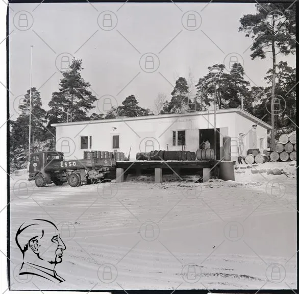 lastbil, Esso, byggnad, vinter, snö, träd, fat, lager, transport, industri, landskap, utomhus, lastning, förråd, väg, skog, vit, svartvitt, retro, 1900-tal, lastbilslast, lastbilschaufför, byggnadsarbete, arbetsplats, miljö, natur, förrådsbyggnad, timmer, lastbilsparkering, lastbilar