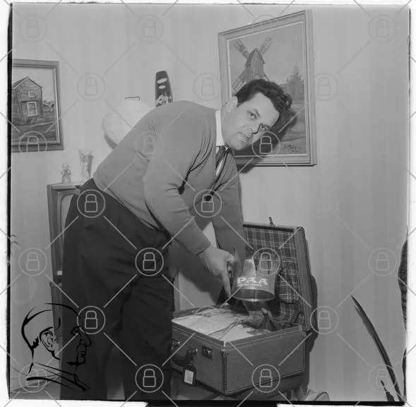 man, resväska, inredning, 1950-tal, hem, kläder, konstverk, vägg, fotografi, svartvitt, paket, förbereda, resa, stil, retro, möbler, kavaj, byxor, leende, aktivitet