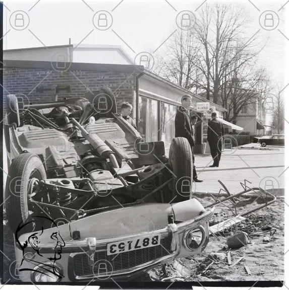 bil, krasch, olycka, uppochned, män, gata, byggnader, träd, 1960-tal, svartvitt, skador, trafik, polis, övervakning, stadsmiljö, väg, fordon, skrot, incident, fotografering, historisk, situation, människor, observation, landskap, säkerhet, utredning, skador, motor, däck