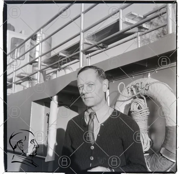 man, båt, svartvit, kläder, marin, livboj, rederi, fotografi, 1900-tal, porträtt, sjöfart, stående, ansikte, tröja, knappar, rep, däck, bakgrund, utomhus, stil, vintage, historia, person, manlig, uttryck, skugga, ljus, detaljer, miljö