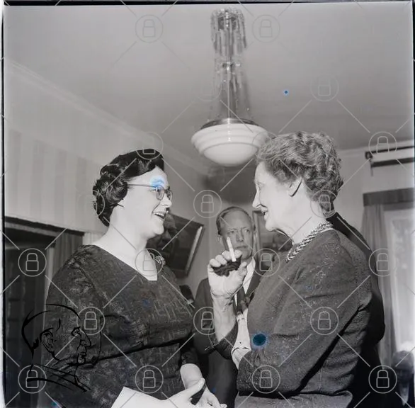 kvinnor, samtal, inomhus, vintage, svartvitt, kläder, 1950-tal, interiör, belysning, socialt, leende, gestikulera, möte, ansikten, traditionell, vänskap, diskussion, familj, nostalgi, historia