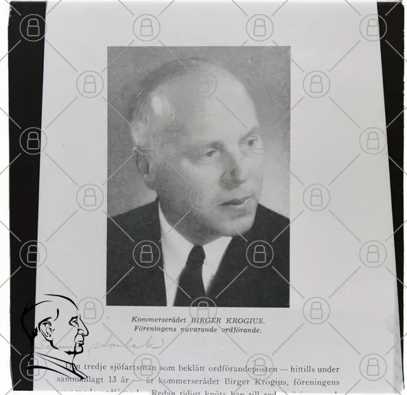 Birger Krogius, kommerserådet, föreningens ordförande, sjöfart, bild, porträtt, svartvitt, text, historia, dokument, 13 år, sammanlagt, ordförande, tredje sjöfararen, bekänt, artordförandeposten, förening, namn, signatur, 1900-tal, professionell, ledarskap, organisation, maritim, svensk