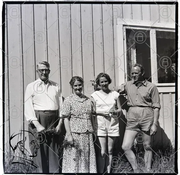 fyra personer, man, kvinna, familj, sommar, kortbyxor, klänning, skjorta, glasögon, fönster, trävägg, gräs, utomhus, svartvitt, gruppfoto, leende, soligt, retro, 1950-tal, avslappnad, stående