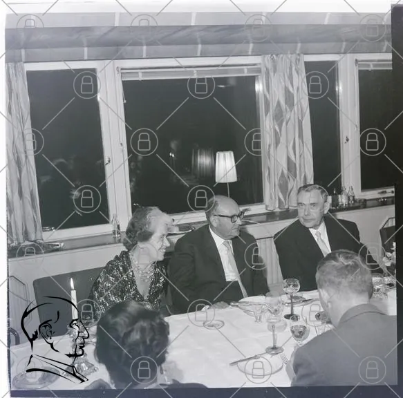 middag, fest, 1950-tal, svartvit, bord, ljus, kvinnor, män, klänning, kostym, glas, skratt, samtal, fönster, inredning, elegans, socialt, samvaro, mat, dryck, belysning, atmosfär, stil, tradition, kultur, gemenskap, nöje, minnen, historia, tidsepok