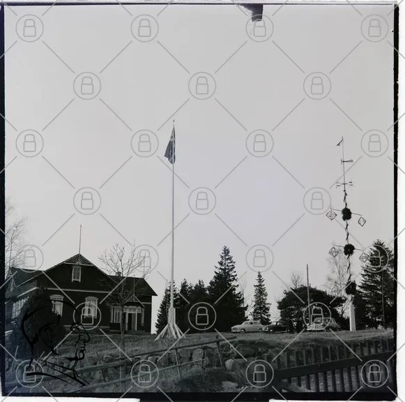 hus, flaggstång, granar, bil, landskap, träd, vinter, svartvitt, byggnad, flagga, dekorationer, gård, natur, svensk, tradition, stuga, utsikt, väg, himmel, monument, kultur, fest, sommar, högtid, landsbygd, stillhet, historia, samhälle, gemenskap, festligheter, skandinavisk