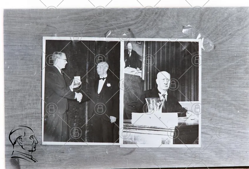 ceremoni, utmärkelse, handskakning, kostym, svartvitt, porträtt, talare, bord, glas, blommor, historisk, evenemang, dignitärer, fotografi, 1900-tal, fest, medalj, presentation, högtidlighet, konferens, samling