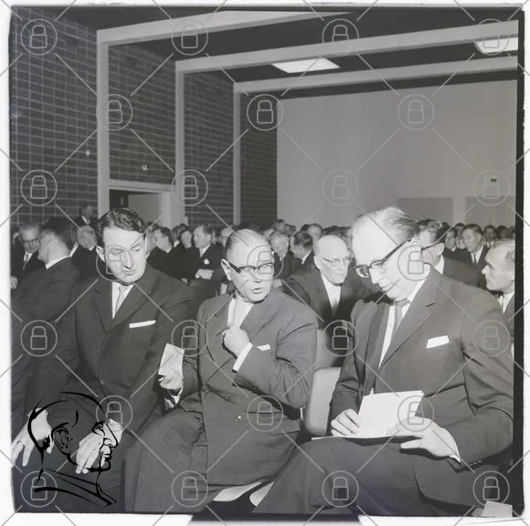 möte, konferens, män, kostymer, publik, sittande, inomhus, svartvitt, 1960-tal, affärsmän, diskussion, allvarliga, anteckningar, åhörare, formell, samling, presentation, talare, evenemang, professionell, interaktion, fokus, stil, traditionell, kontor, samhälle, nätverkande, ledarskap, historia, kultur