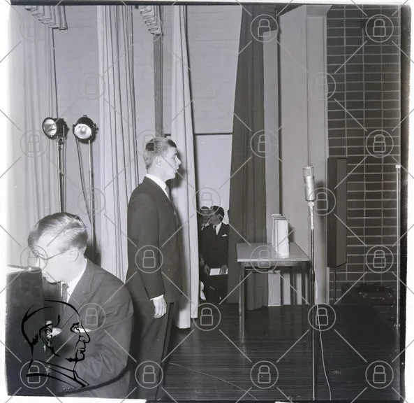 scen, män, piano, mikrofon, kläder, uppträdande, ljus, publik, 1960-tal, svartvitt, musik, stående, sittande, bord, gardiner, inomhus, evenemang, artister, framträdande, stil, retro, klassisk, underhållning, föreställning, kavaj, slips, skådespelare, musikaliskt, atmosfär, kultur