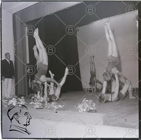gymnastik, uppträdande, scen, svartvitt, 1950-tal, akrobatik, dans, sport, publik, blommor, kostymer, kvinnor, prestation, gymnastikdräkter, träning, balans, rörelse, konsert, föreställning, tradition, samarbete, kroppsspråk, elegans, stil, gymnastikövningar, artistisk