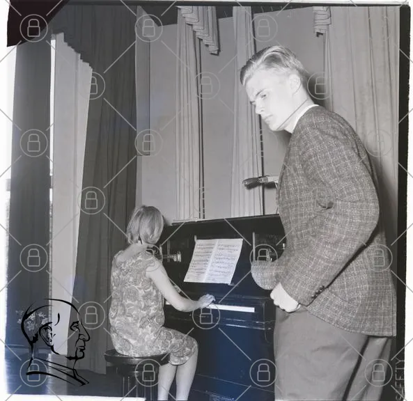 piano, kvinna, man, musik, svartvitt, kläder, 1960-tal, inomhus, spelande, notblad, koncentration, sittande, stående, interaktion, scen, kultur, klassisk musik, vintage, retro, föreställning, artist, kreativitet, stil, elegans, rum, gardiner, möbler, instrument, prestation, uttryck