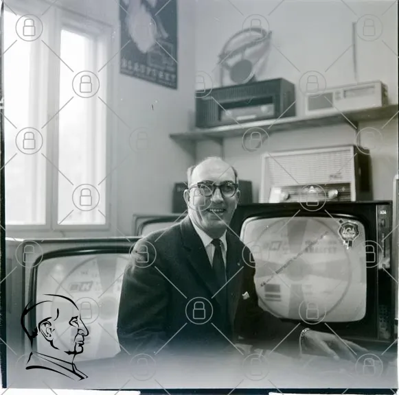 man, glasögon, kostym, leende, gammal, tv, teknik, kontor, vintage, svartvit, inredning, radio, apparater, 1900-tal, retro, möbler, fönster, poster, skärm, bildskärm, elektronik, stil, professionell, interiör, fotografi, nostalgi, kommunikation, media, historia, kultur