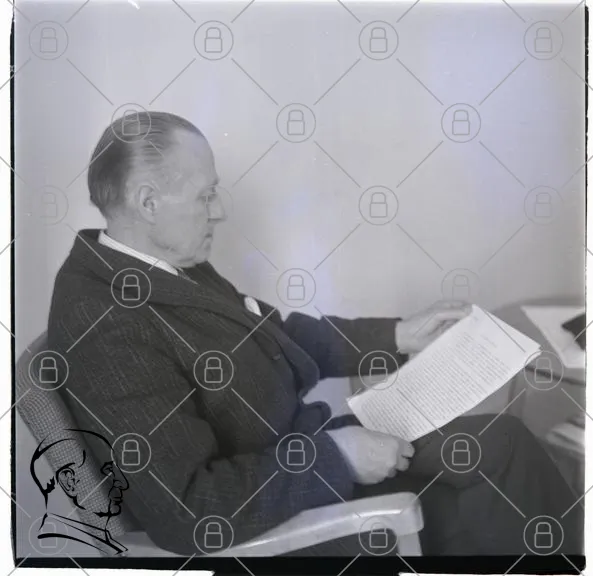 man, sittande, läsande, dokument, kontor, kläder, kostym, papper, svartvitt, inomhus, 1900-tal, stil, eftertänksam, möbel, fåtölj, ansiktsuttryck, koncentration, äldre, manlig, professionell