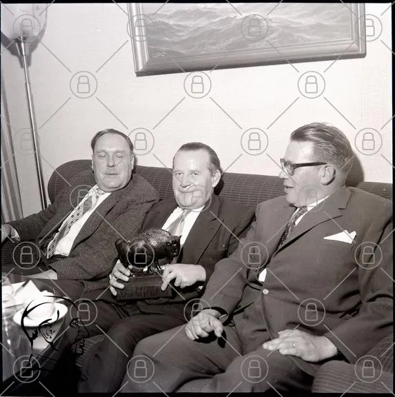 män, sittande, soffa, svartvitt, kläder, kostymer, glasögon, leende, statuett, kaffe, 1900-tal, inomhus, möbler, diskussion, vänner, porträtt, tradition, samling, socialt, nostalgi