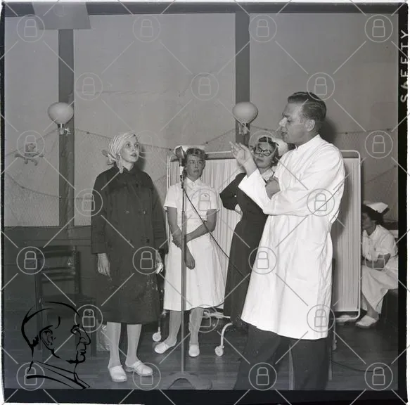 läkare, sjuksköterskor, kvinna, föreläsning, medicin, 1950-tal, kläder, svartvitt, scen, mikrofon, publik, utbildning, hälsa, säkerhet, sjukhus, professionell, demonstration, medicinsk, vård, interaktion, medicinsk utbildning, kvinnor, man, klädd i vitt, stående, sittande, rum, belysning, retro