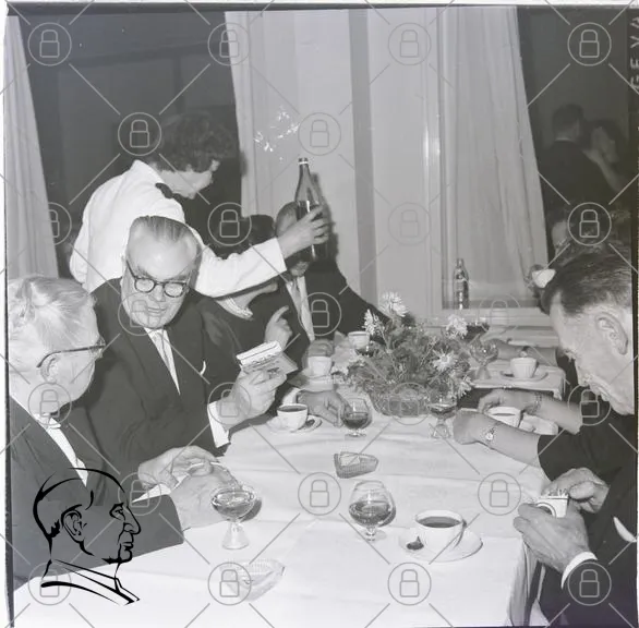 middag, fest, bord, kaffe, blommor, servitör, glas, män, kostymer, samtal, dukat, sällskap, dryck, 1960-tal, elegans, socialt, samling, mat, dessert, servett