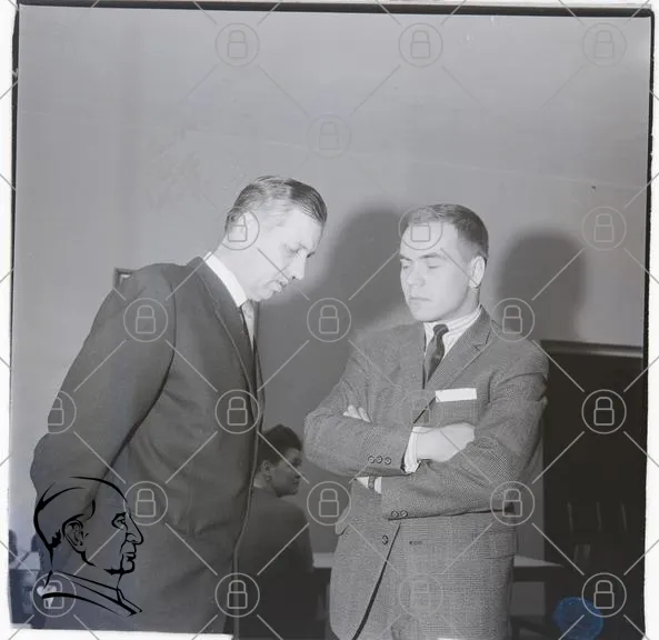 män, kostymer, diskussion, inomhus, svartvitt, 1960-tal, affärsmöte, allvarliga, ansiktsuttryck, kläder, kontor, stående, kroppsspråk, professionellt, interaktion, bakgrund, möbler, stil, formell, kommunikation
