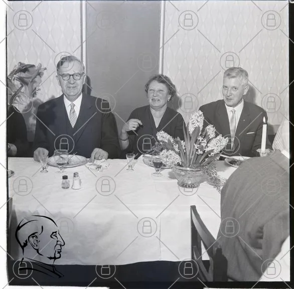 middag, fest, sällskap, bord, mat, glas, blommor, ljus, kläder, leende, äldre, män, kvinnor, samtal, servett, tallrikar, skålar, dukning, tradition, samvaro, 1950-tal, svartvitt, fotografi, socialt, gemenskap, festligheter, familj, vänskap, restaurang, högtid
