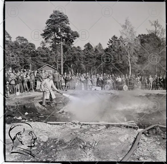 skogsbrand, brandman, vatten, släckning, publik, träd, natur, brand, rök, säkerhet, demonstration, händelse, 1900-tal, svartvit, utomhus, samling, verktyg, brandutrustning, jord, mark, eldsflammor, åskådare, aktivitet, utbildning, räddningstjänst, skog, miljö, samhälle, tradition