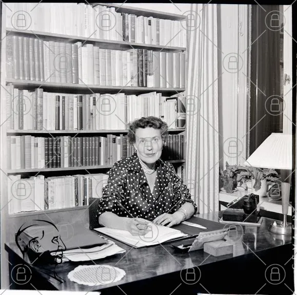 kvinna, skrivbord, böcker, bibliotek, kontor, svartvitt, anteckningsbok, glasögon, fönster, växter, kläder, prickig, inredning, papper, telefon, skrivmaterial, studier, akademisk, 1900-tal, porträtt, heminredning, litteratur, forskning, arbete, professionell, leende, kvinnohistoria, kultur, intellektuell, traditionell