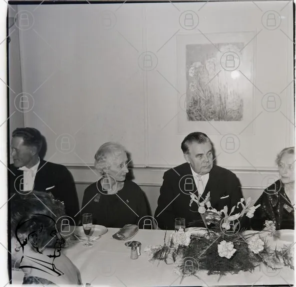 middag, fest, människor, kläder, svartvitt, bord, dukning, samtal, dekoration, konstverk, glas, tallrikar, servetter, leenden, elegans, sällskap, tradition, 1900-tal, socialt, samvaro