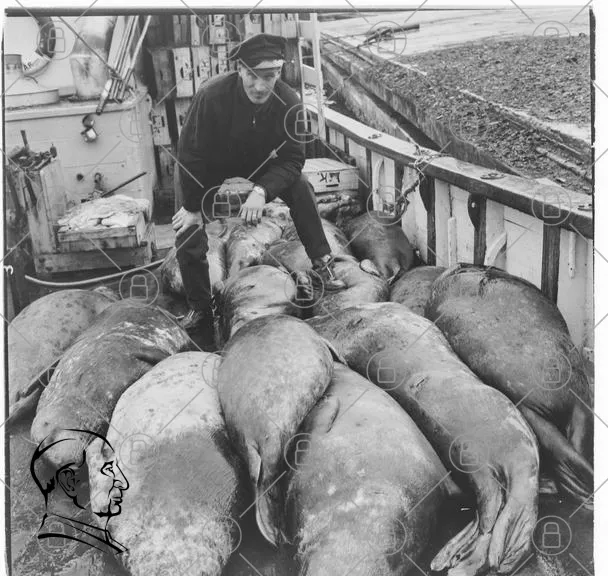 fiskare, säl, båt, fångst, hav, marin, svartvit, man, arbetskläder, fiskeutrustning, däck, djur, natur, kust, traditionellt, fiske, sjöfart, fiskeindustri, havsdjur, fångstmetod, sjö, fiskehistorik, yrke, fiskeområde, säljakt, fiskeplats, båttransport, fiskehandlare, sälfångst, havsmiljö