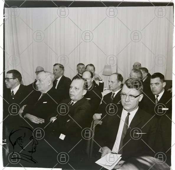 möte, män, kostymer, 1960-tal, svartvitt, publik, konferens, affärsmän, sittande, allvarliga, diskussion, inomhus, kläder, ansiktsuttryck, lampor, bakgrund, stil, formell, samling, grupp, professionell, traditionell, presentation, åhörare, evenemang, historia, retro, vintage, samhälle, ledarskap