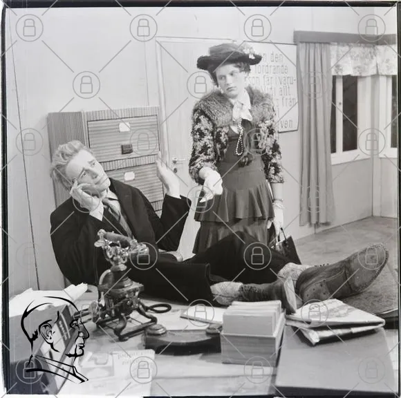 man, kvinna, kontor, telefon, skrivbord, kläder, 1900-tal, svartvitt, möbler, dokument, handväska, hatt, skåp, fönster, interiör, pose, uttryck, vintage, stil, scen, drama, komedi, skådespel, rekvisita, fotografi, konst, teater, humor, situation, karaktärer
