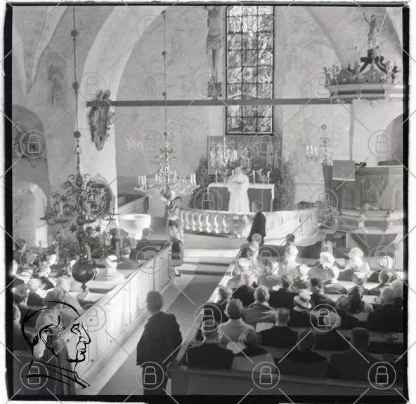 kyrka, gudstjänst, predikan, människor, bänkar, altare, fönster, ljus, kläder, tradition, samling, religiös, ceremonin, konst, skulpturer, musik, andakt, högtid, gemenskap, historia, svartvitt, 1900-tal, kultur, tro, fest, stämning, belysning, dekoration, väggmålningar, präster