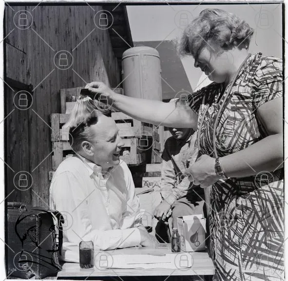 man, kvinna, skratt, frisyr, utomhus, bord, dryck, glasflaska, kläder, sol, skugga, trävägg, lådor, leende, interaktion, frisör, sommar, socialt, samtal, retro, 1950-tal, svartvitt, fotografi, humor, vardag, scen, människor, frisyr, frisör
