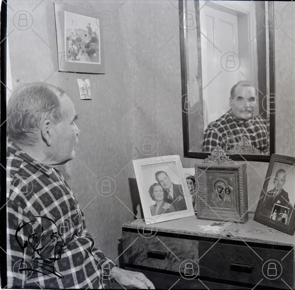 gammal man, spegel, fotografier, inredning, svartvitt, hem, möbler, väggkonst, porträtt, familjefoton, skåp, rutig skjorta, nostalgi, reflektion, gammal stil, heminredning, minnen, personligt, interiör, vintage, traditionell, stillhet, ensamhet, känslor, historia, tidlös, rum, detaljer, ansikte
