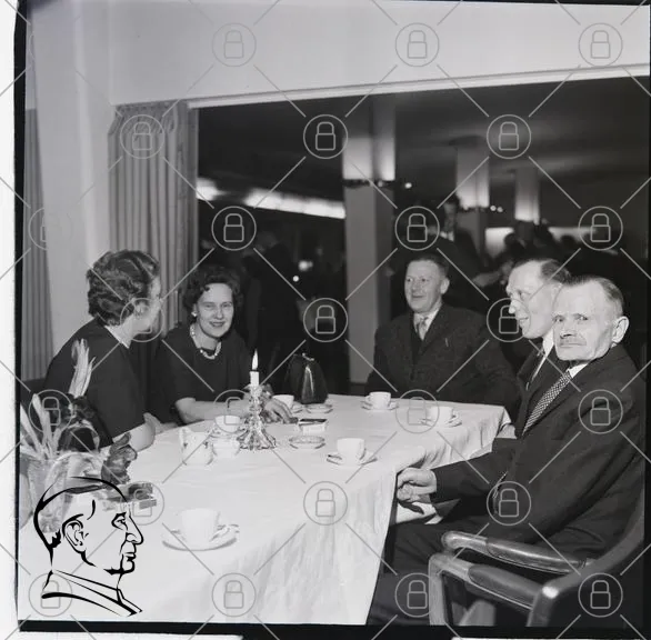 middag, sällskap, bord, kaffe, te, dukning, kläder, 1950-tal, fest, samtal, leenden, glas, porslin, inredning, eleganta, män, kvinnor, socialt, evenemang, svartvitt, retro, stil, tradition, samling, gemenskap, festligheter, restaurang, atmosfär, ljus, dekoration, servetter