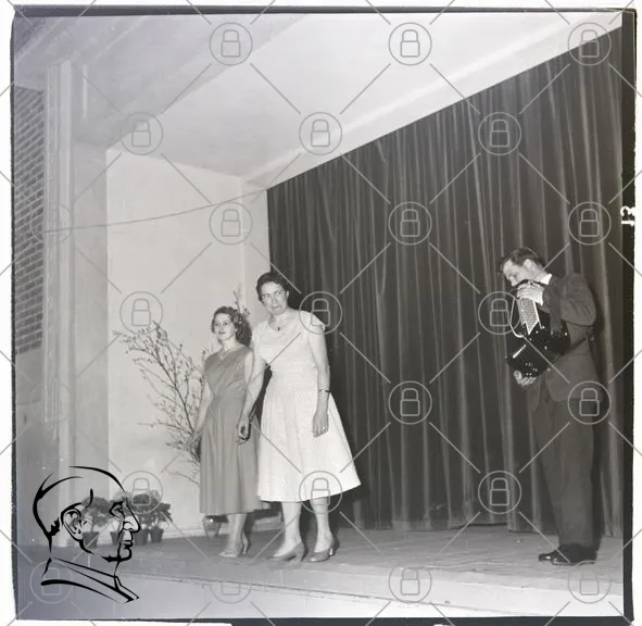 scen, gardin, kvinnor, man, klänningar, kostym, blommor, uppträdande, fotograf, retro, svartvitt, 1950-tal, mikrofon, leende, formellt, evenemang, inomhus, publik, mode, vintage