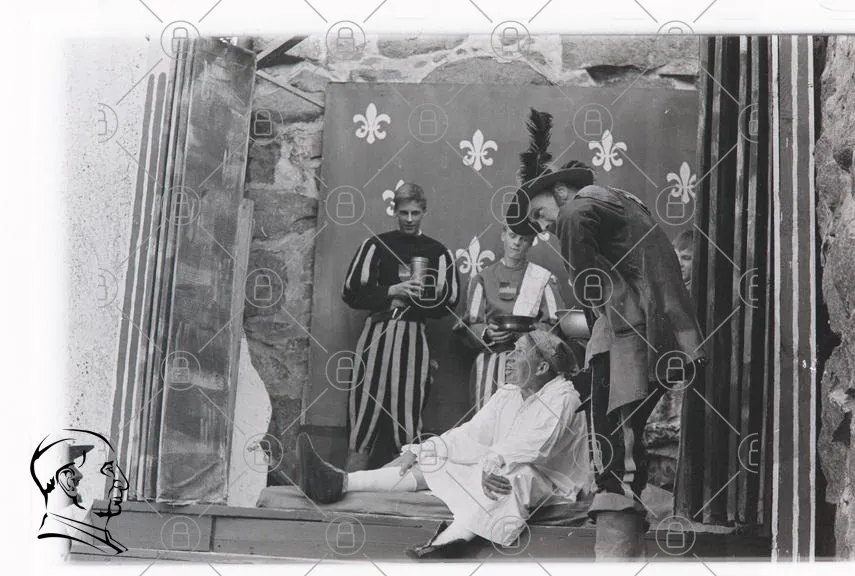 teater, skådespelare, kostymer, svartvitt, scen, föreställning, historisk, kläder, rekvisita, publik, komedi, drama, 1900-tal, underhållning, tradition, kultur, maskerad, teaterkonst, uttryck, gest, interaktion, skämt, karaktärer, folkliv, performance, konst, kreativitet, berättande