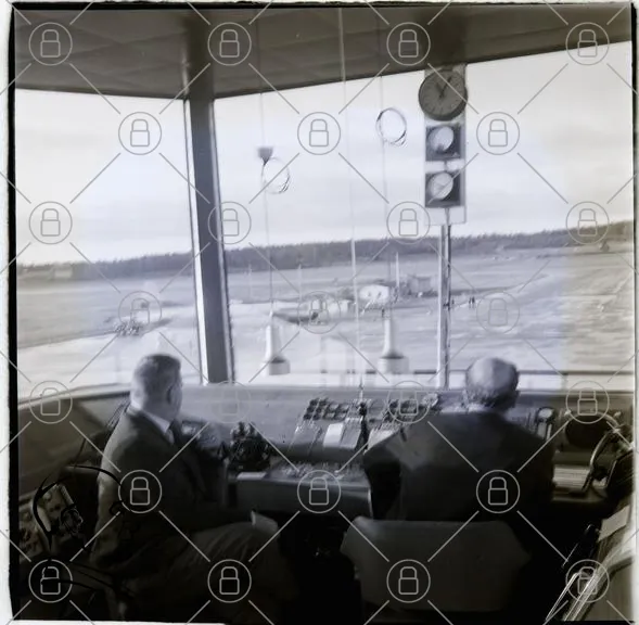 flygplats, kontrolltorn, flygtrafik, flygplan, övervakning, piloter, kommunikation, tid, säkerhet, teknik, 1960-tal, luftfart, arbete, utsikt, kontroller, instrument, signaler, fönster, personal, flygledning