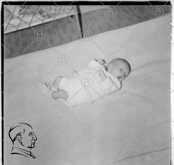 bebis, nyfödd, liggande, filt, säng, svartvit, barn, kläder, spjälsäng, inomhus, sött, ansikte, händer, mjuk, sovande, baby, tidigt 1900-tal, retro, familj, kärlek, oskuld, trygghet, barnrum, minnen, fotografi, nostalgi, enkelhet, sårbarhet, liv