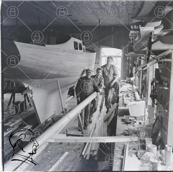 båt, båtbyggeri, trä, hantverkare, verkstad, träarbete, byggmaterial, män, arbete, tradition, hantverk, marin, konstruktion, verktyg, träbitar, båtmodell, inomhus, svartvitt, historia, yrke, samarbete