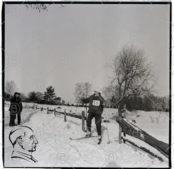 skidåkning, vinter, snö, tävling, nummerlapp, 54, staket, träd, landskap, åskådare, svartvitt, utomhus, sport, skidspår, vinterkläder