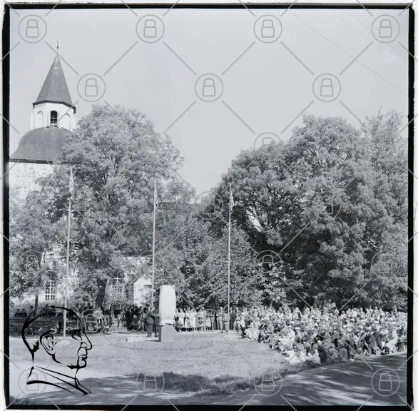 kyrka, träd, människor, samling, flaggor, monument, ceremoni, byggnad, sommar, utomhus, historisk, svartvit, landskap, torg, fest, tradition, grupp, tal, uppvaktning, kultur, evenemang, samhälle, natur, minnesstund, fotografering, arkitektur, plats, gemenskap, högtid