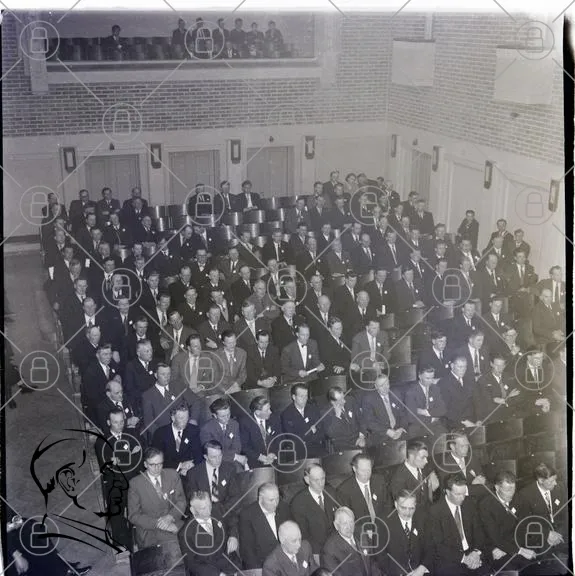 publik, möte, konferens, män, kostymer, slipsar, stolar, sal, åhörare, 1900-tal, svartvitt, inomhus, samling, formell, evenemang, ålder, tradition, organisation, diskussion, presentation