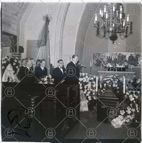 begravning, kyrka, blommor, talare, sorg, män, kista, ljus, bänkar, dekoration, högtidlighet, minnesstund, svartvitt, samling, tradition, respekt, ceremonin, familj, vänner, gemenskap, andakt, sorgprocess, religiös, kultur, historia, känslor, minnen, avsked, rituell