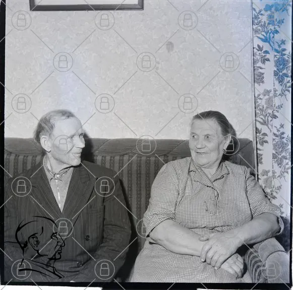 par, äldre, människa, kvinna, soffa, leende, svartvitt, fotografi, inomhus, interiör, traditionell, kläder, ansiktsuttryck, nostalgi, familj, samvaro, hem, bakgrund, vägg, mönster, tidsepok, kultur, relation, vänskap, minnen, historia, porträtt, gemenskap, kärlek, livserfarenhet