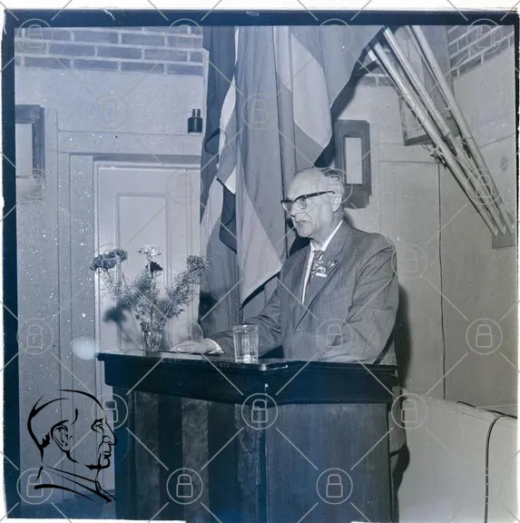 talare, podium, blommor, glas, flaggor, väggar, inomhus, svartvitt, evenemang, föreläsning, kläder, man, mikrofon, dekoration, samling, historia, tradition, samhälle, presentation, fest, kultur, stil, 1900-tal, arrangemang, publik, tal, uttryck, engagemang, minnen
