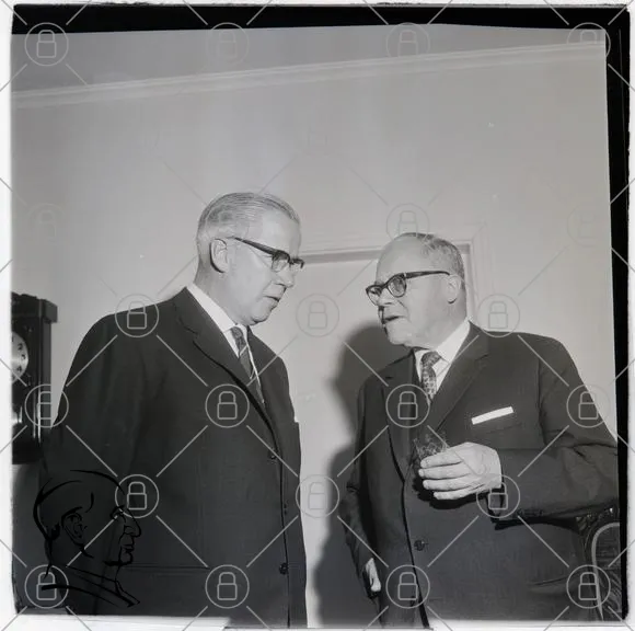 två män, kostymer, glas, samtal, svartvitt, inomhus, klocka, 1960-tal, formell klädsel, glasögon, diskussion, affärsmöte, professionell, interiör, stil, vintage, retro, socialt, uttryck, kroppsspråk, relation, miljö, rum, detaljer, ansiktsuttryck, manlig, vuxna, traditionell, klädsel