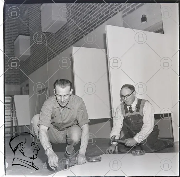 män, arbete, konst, målning, inomhus, verkstad, 1950-tal, hantverk, penslar, färg, skisser, kreativitet, design, byggnad, material, professionell, samarbete, konstnärer, arbetskläder, verktyg, projekt, studio, retro, svartvitt, fotografi, tradition, teknik, detaljer, ytor, linjer, former