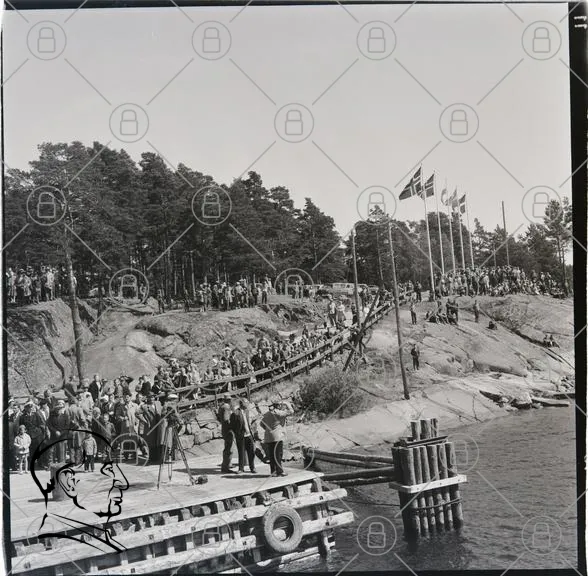 skärgård, människor, flaggor, träbro, båt, kaj, träd, samling, fotografering, 1900-tal, natur, landskap, evenemang, fest, svartvitt, historia, strand, vatten, klippor, publik, tradition, utomhus, sommar, kultur, aktivitet, festligheter