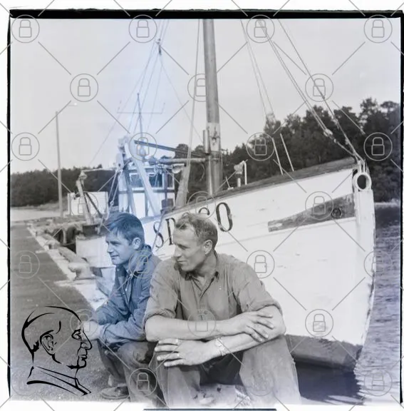båt, hamn, män, fiske, svartvitt, strand, kaj, träbåt, sjö, sommar, kläder, avslappnad, natur, vatten, landskap, båtliv, tradition, historia, gemenskap, arbete
