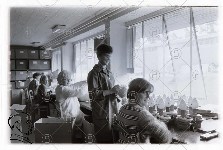 arbete, kvinnor, fabrik, hantverk, produktion, 1960-tal, svartvit, samarbete, kontor, fönster, lådor, leenden, handarbete, tradition, miljö, inomhus, verkstad, kreativitet, arbetsplats, retro