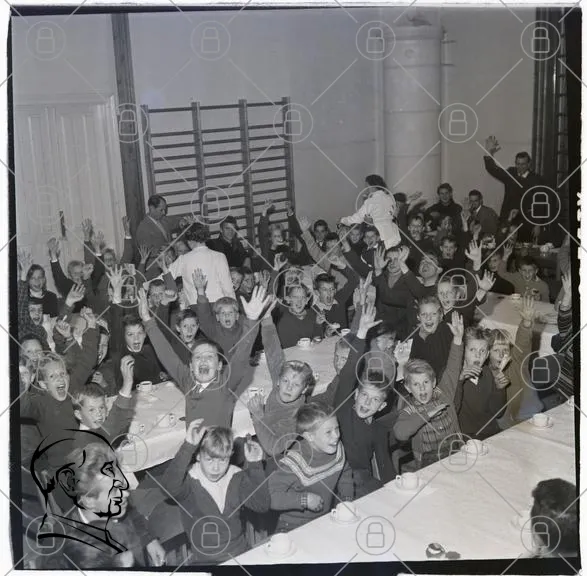 barn, fest, glädje, samling, bord, händer, skratt, kläder, inomhus, aktivitet, grupp, ungdomar, servering, tårta, dryck, leenden, skola, evenemang, 1960-tal, svartvitt, gemenskap