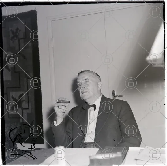 man, kostym, slips, kontor, skrivbord, glas, eftertänksam, svartvitt, fotografi, 1900-tal, inomhus, möbler, väggkonst, ansiktsuttryck, hand, sittande, professionell, stil, retro, klassisk, elegant, belysning, detaljer, interiör, uttryck, gammal, traditionell, tidlös, affärsmann, kontorsmiljö